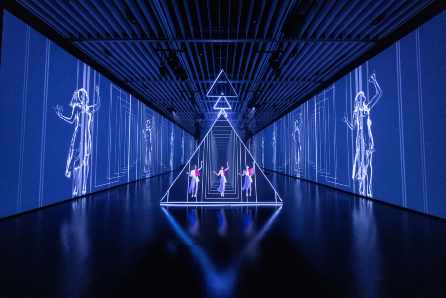 アーティストの身体性とテクノロジーの同期をテーマに、25年のデータを可視化したPerfumeの展覧会。企画から施工までトータルでサポートし、ライブ演出へも発展。