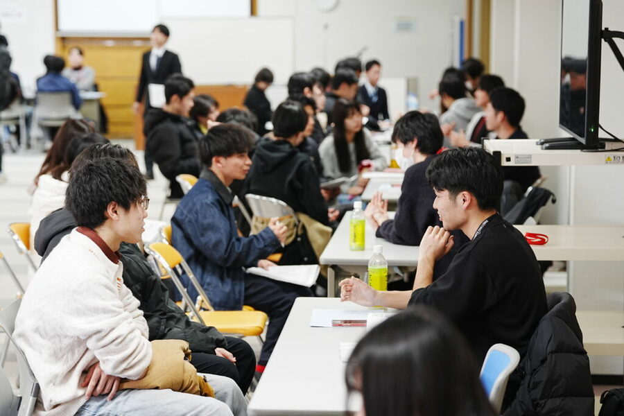 「就活祭」は、今年で24回目を迎える京都産業大学の恒例進路・就職支援イベントです。進路が決定した4年次生が中心となって運営し、内定者としての経験を生かして、自己分析の方法や模擬面接、業界理解のポイントなどを後輩に向けて丁寧にアドバイスしました。