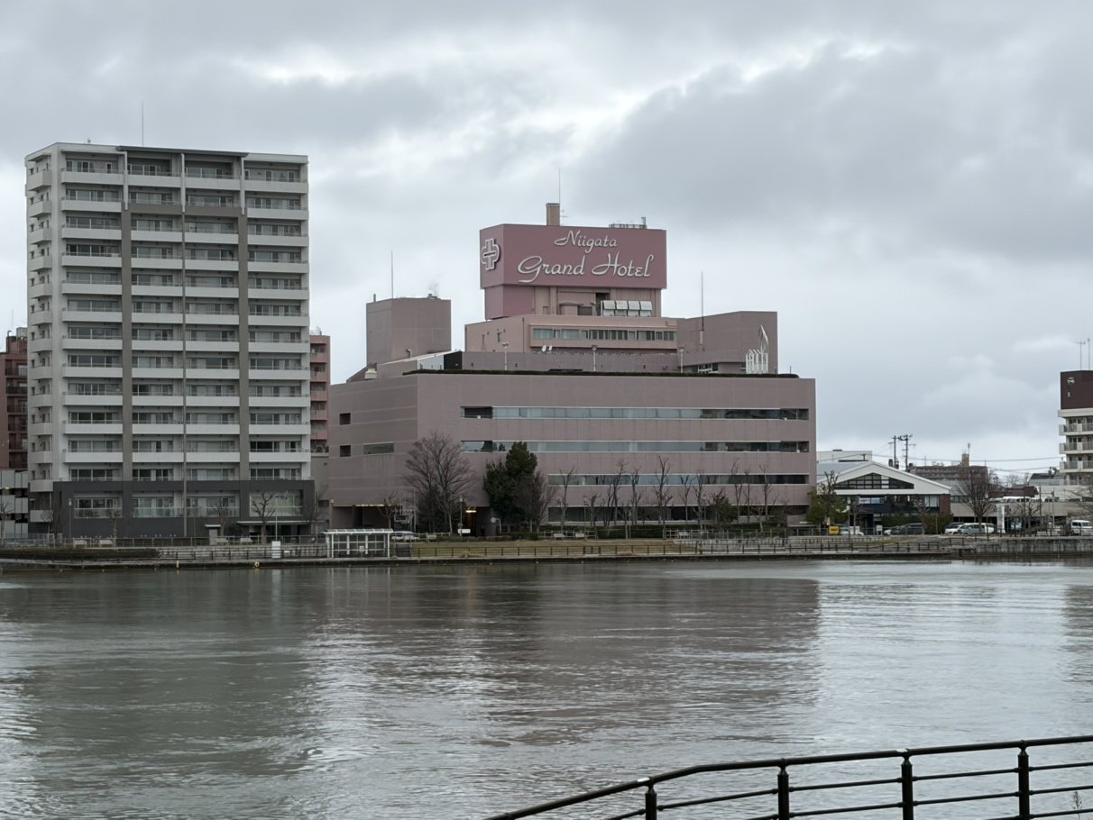 【午後3時】対局会場となる新潟グランドホテルです。手前に流れる川は信濃川です。