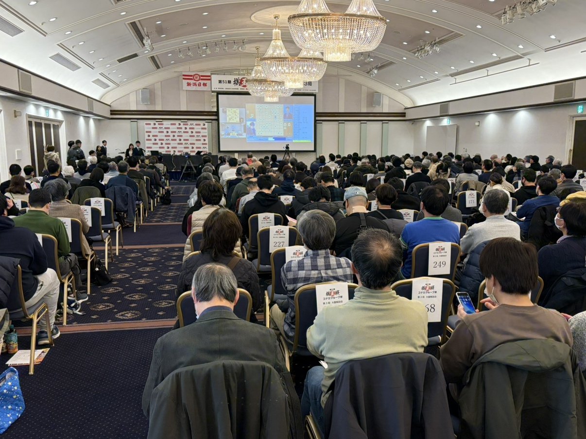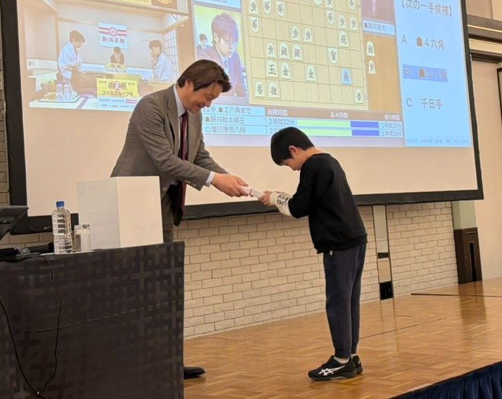 【午後4時半前】「次の一手クイズ」の正解は「▲2八角」でした。抽選会が始まり、最初の賞品は第50期棋王就任の記念で藤井棋王が揮毫した扇子です。