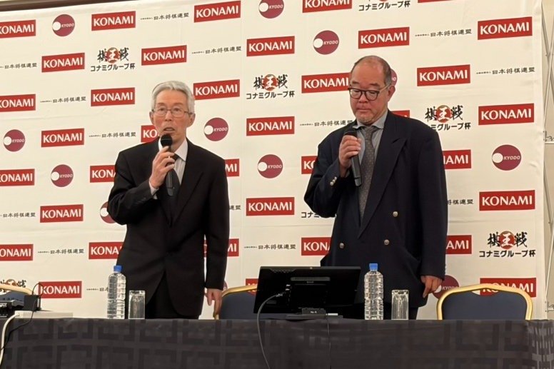 【午後2時半前】大盤解説会は佐々木七段と本田女流四段が休憩に入り、日本将棋連盟県支部連合会会長の奥州光治さんと元県アマ名人の早川俊さんのミニ解説に。
