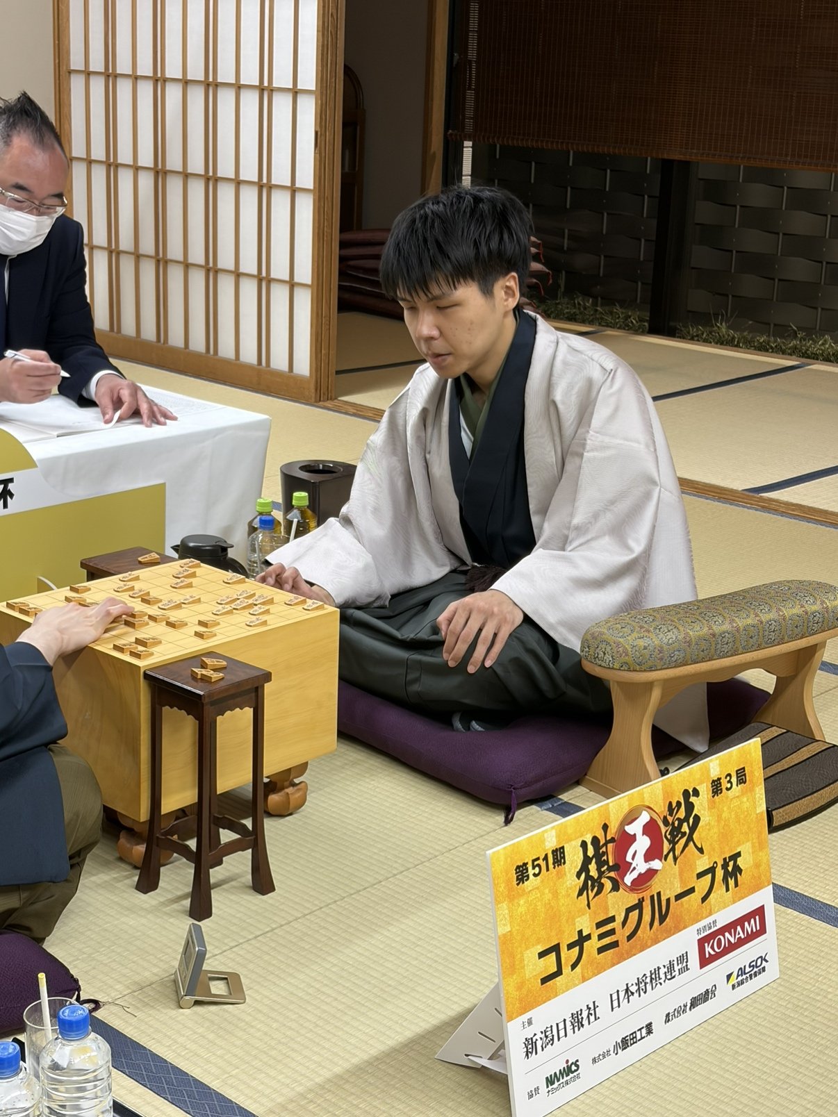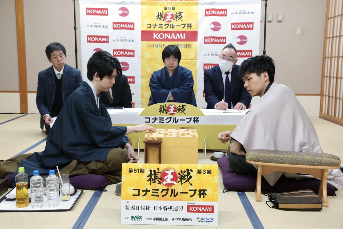 将棋の藤井聡太棋王(23)=竜王・名人・王位・棋聖・王将との六冠=に増田康宏八段(28)が挑んでいる第51期棋王戦コナミグループ杯(新潟日報社など主催)5番勝負第3局が3月1日、新潟市中央区の新潟グランドホテルで指されました。白熱の終盤戦の末、対局開始から10時間以上が経過した午後7時過ぎ、藤井聡太棋王が投了、増田康宏八段が大逆転でタイトルに王手をかけました。