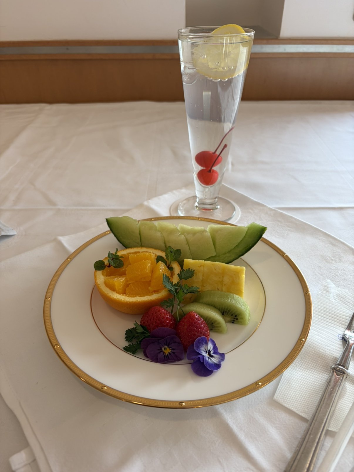 増田八段は「フルーツ盛り合わせ」とレモンスカッシュ。ホテルによると、通常メニューにはない「棋王戦特別メニュー」とのことです。彩りも鮮やかです。