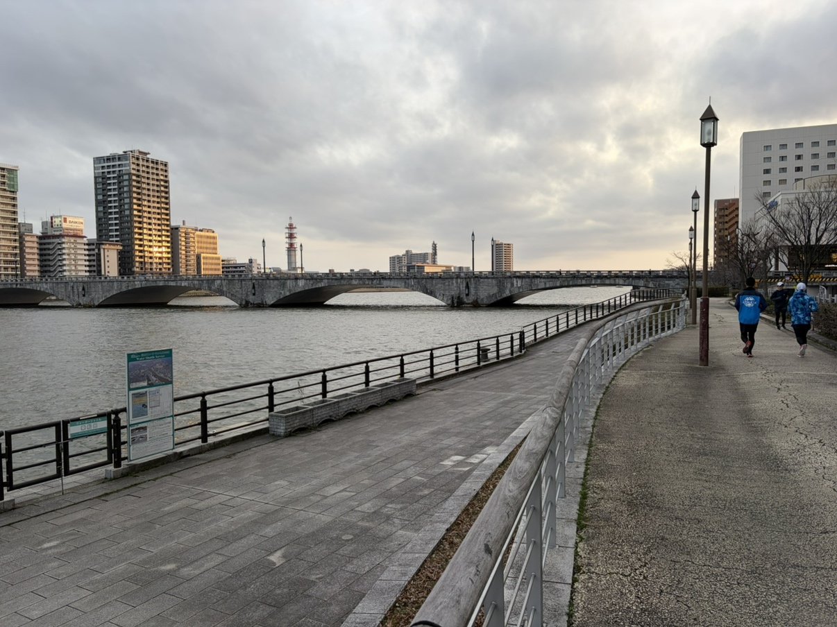 【午後5時20分】対局開始から8時間がたち、新潟市はまもなく日没です。信濃川と萬代橋が夕陽に照らされています。