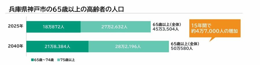 日本医師会によると、神戸市では総人口が減少局面にある一方で、65歳以上の高齢者数は今後15年で約4万7,000人増加し、2040年には50万人を突破することが予測されています(※1)。この高齢化の進行に伴い、2050年の介護需要予測指数(2020年=100)は129まで急増する見込みであり、これは全国平均値(125)を上回る高い水準です(※1)。