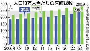 新潟県の人口10万人当たりの医師総数が、2024年末時点で238・4人となり、都道府県別で5番目に少ない43位になったことが26日までに厚生労働省の統計で分かった。前回(22年末)の227・3人から11・1人増え、順位を一つ上げた。全国平均の280・9人は下回った=グラフ参照=。