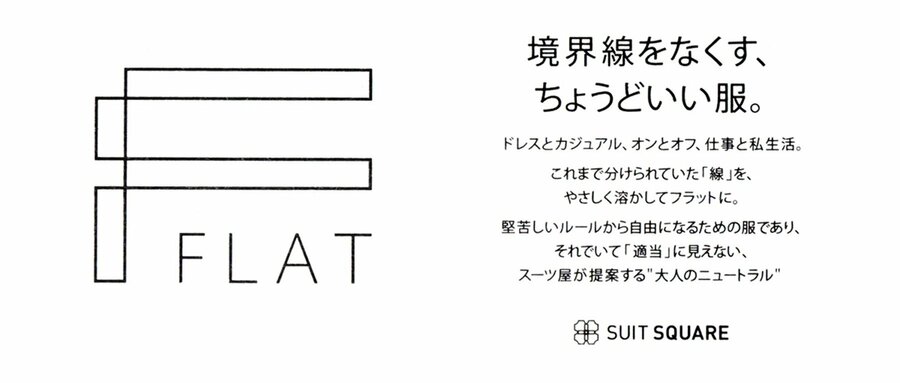 「FLAT」は、仕事とプライベートの境界線をなくし、もっと自由でフラットな気持ちでファッションを楽しんでほしいという思いから誕生しました。その背景には、近年オフィスウエアの多様化により「カジュアルな服装にしたいと思っているが、実際何がいいのか分からない。カジュアルで整った服装が分からない」というビジネスパーソンの悩みの声があがっていたからです。そのような悩みに対して「FLAT」は、長年ビジネスウエアを取り扱ってきたスーツスクエアだからこそ提案できる、オンオフ兼用キレイ目カジュアルウエアとなっています。