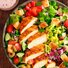 ロメインレタス、キュウリ、ブラックオリーブ、トマト、パプリカなどをレッドワインシーザードレッシングで和え、ケイジャンチキンをトッピング。