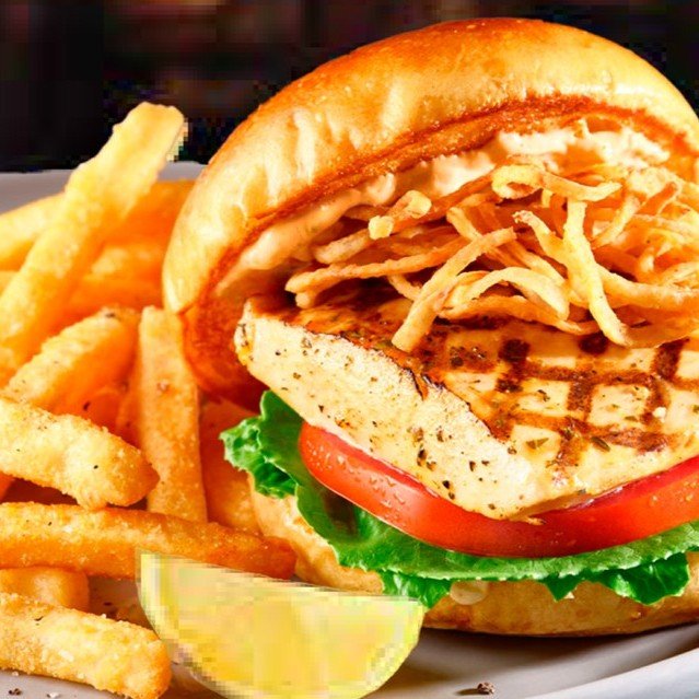 レモンハーブバターでグリルしたマヒマヒに、クリスピーオニオンをトッピングし、レムラードソース、トマト、リーフレタスを挟んだサンドイッチ。フレンチフライ付き。