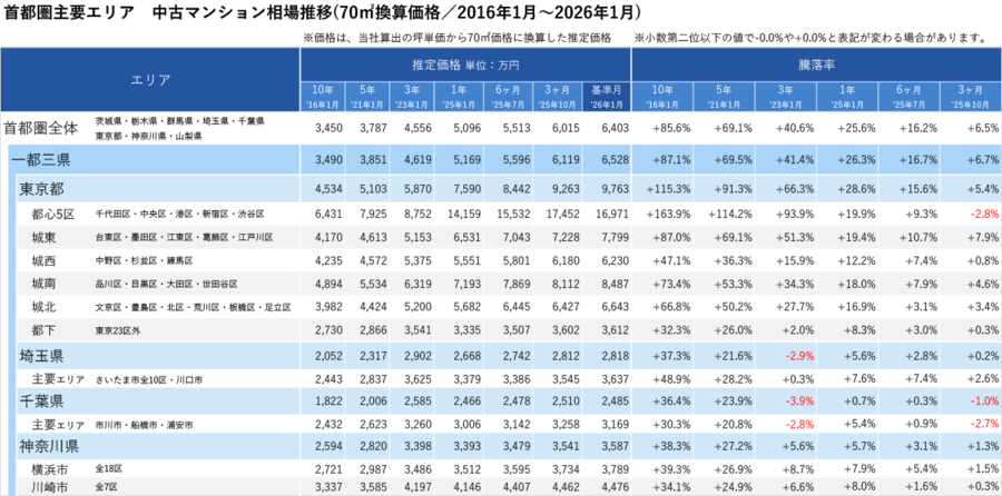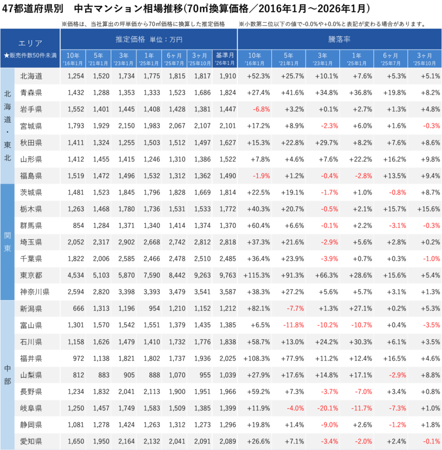 「不動産×WEB×ビッグデータ」の領域で、さまざまな不動産テックサービスを展開する株式会社ワンノブアカインド(本社:東京都港区、代表取締役社長:川島 直也、以下当社)は、当社が運営しているマンション情報サイト「マンションレビュー」の保有データを元に、全国の2026年1月の中古マンション相場を調査。坪単価をベースに70㎡での価格に換算した「中古マンション価格」*1について、10年前・5年前・3年前・前年からの推移を都道府県別・エリアごとにまとめましたので、発表いたします。