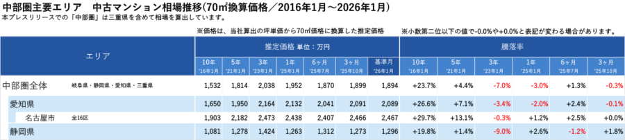 ■中部圏主要エリア 中古マンション相場推移(2016年1月~2026年1月)
