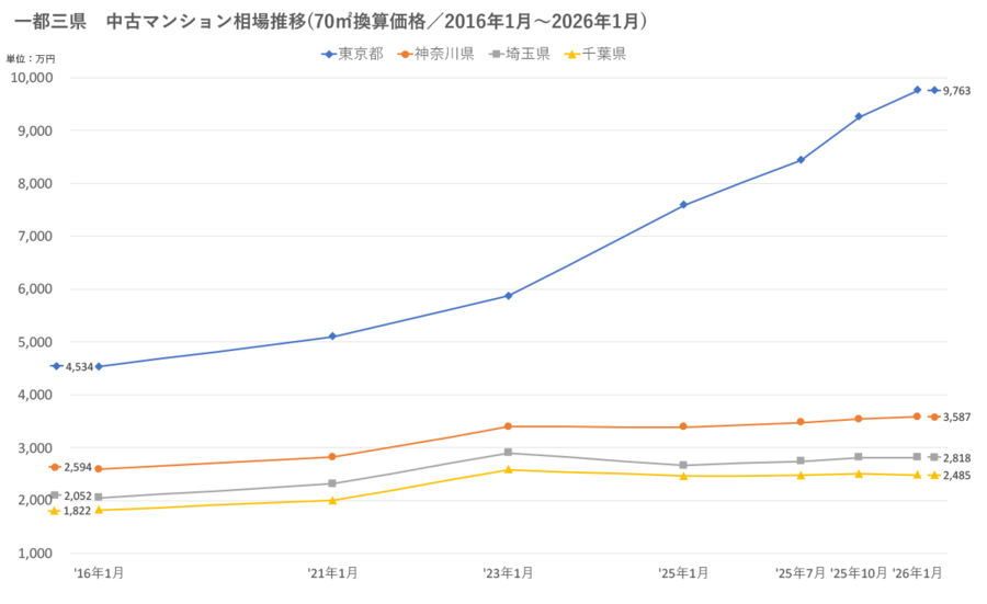 ■首都圏主要エリア 中古マンション相場推移(2016年1月~2026年1月)