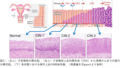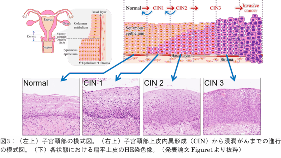子宮頸がんの前がん病変。子宮頸部の扁平上皮は上皮とその下にある間質が基底膜で隔てられた構造になっており、主にヒトパピローマウイルス(HPV)への感染により発生した異型細胞は基底膜の上皮側に発生する。上皮内の異型細胞の割合が1/3以下の状態を軽度異形成(CIN1)、2/3以下を中程度異形成(CIN2)、それ以上を高度異形成・上皮内がん(CIN3)とよぶ。表層まで達すると浸潤方向が基底膜方向に進み、浸潤がんへと進行する。軽度・中程度異形成は免疫により自然治癒することが多いが、高リスク型HPVの持続的もしくは断続的感染により10年単位の長時間を掛けて上皮内がん、浸潤がんへと進行するため定期的な経過観察が必要である。