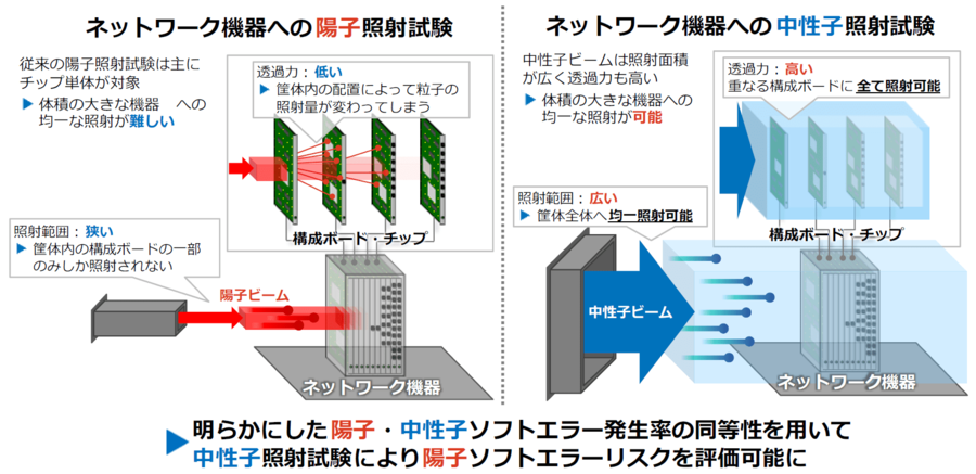 20メガ電子ボルト(MeV)以上の運動エネルギー帯で、陽子と中性子によるソフトエラー発生率が同等であることを実証したことで、宇宙向け評価においても中性子照射試験を活用した評価が可能となりました。