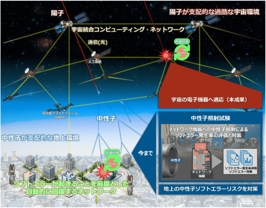 従来は地上と宇宙空間における機器への宇宙放射線影響を把握するためには、中性子照射試験と陽子照射試験をそれぞれ実施する必要がありましたが、本成果により、1回の中性子照射試験で両方とも評価可能にし、照射試験のコスト削減・期間短縮を実現します。また、試験機会の確保が容易になり、民間企業の宇宙産業への参入のハードルを低減します。その結果、宇宙向けのICTインフラを支える電子機器のソフトエラーのリスクを開発段階で見積もりやすくして運用前の対処を可能とすることで、安心・安全な宇宙インフラの構築に貢献します(図1)。