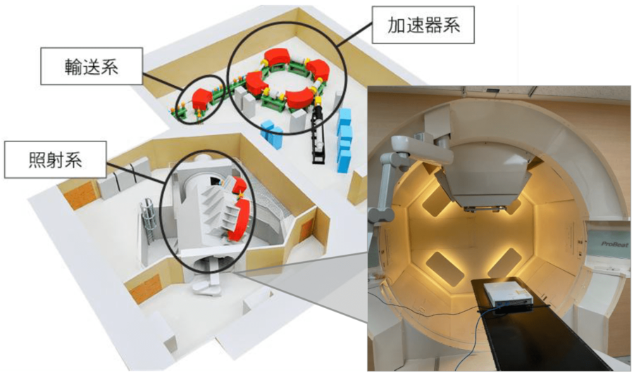 この同等性を実証するため、高崎量子技術基盤研究所のイオン照射研究施設(TIARA)における10~65 MeVの陽子照射試験を実施し、陽子によるソフトエラー発生率を測定しました。さらに、より高エネルギー帯を測定するために、通常医療目的で利用されている北海道大学病院の陽子線治療センター(図5)において、がん治療向けの設定条件を電子機器評価に適用できるよう換算し、電子機器に対する陽子照射試験として実施することで、70~220 MeVまでの陽子によるソフトエラー発生率を測定しました。