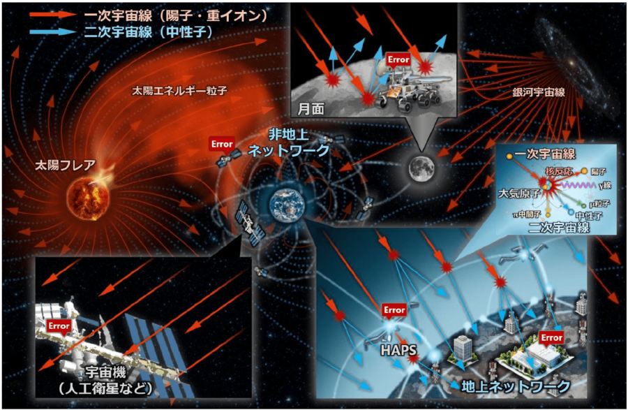 宇宙から飛来する放射線(宇宙放射線)のうち、宇宙空間で主要な「陽子」と地上の大気中で主要な「中性子」に関して、それらが半導体に誤動作(ソフトエラー)を引き起こす確率が、宇宙空間で大部分を占める高エネルギー帯では同等であることを世界で初めて実証しました。