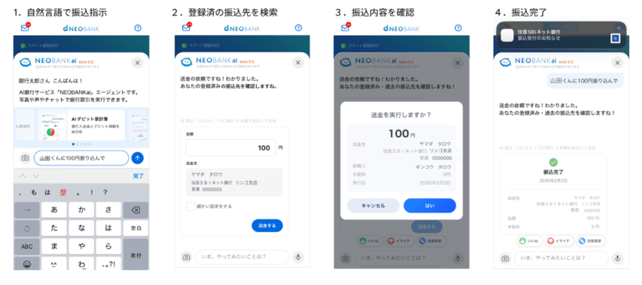住信SBIネット銀行株式会社(本社:東京都港区、代表取締役社長(CEO):円山 法昭、以下「住信SBIネット銀行」)は、生成AIとの対話を通じて利用者の目的を理解し、それを起点に最適な画面をその場で自動生成する“ジェネレーティブUI”を採用した「NEOBANK ai」エージェントのベータテストを、2026年2月27日(金)より順次開始いたします。自然言語での依頼をもとに、振込などの取引や目的に応じたUIを生成(ジェネレーティブUI)し、実行できる AIエージェントを銀行アプリ上で顧客開放するのは邦銀としては初めて※1の試みとなります。