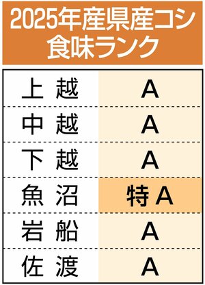 日本穀物検定協会(東京)は27日、2025年産米の食味ランキングを発表した。県産コシヒカリの6銘柄のうち、5段階評価で最高の「特A」と評価されたのは3年連続で魚沼のみだった。ほかの5産地は前年と同じ「A」。全国的には高温耐性品種を中心に特Aが増えており、県産米は暑さへの対応が課題であることが改めて浮き彫りとなった。