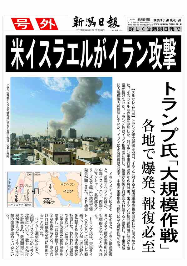 【号外】米、イスラエル両軍がイラン攻撃 2026/2/28 17:50 (最終更新: 2026/2/28 17:50) PDFで号外を見る トップページで最新情報を見る 関連ニュース 【号外】フィギュア女子で中井亜美(新潟市出身)が「銅」! 2/20 【号外】フィギュアペア・りくりゅう金メダル!日本勢初 2/17 【号外】スノボ男子HPで戸塚が金、山田が銅、平野(歩)は7位 2/14 【号外】スノーボード女子ビッグエアで村瀬心椛が「金」 2/10 【号外】スノーボード男子ビッグエアで木村葵来が金、木俣は銀 2/8 【号外】センバツ高校野球、帝京長岡と日本文理が出場決定! 1/30 【号外】衆院選、2月8日投開票 高市早苗首相が23日解散を表明 1/19 【号外】首相、衆院冒頭解散へ 1/13 【号外】柏崎刈羽原発再稼働「同意」、花角知事が赤沢経産相に伝達 2025/12/23 【号外】柏崎刈羽原発再稼働「容認」 新潟県議会、花角英世知事を信任 2025/12/22 【号外】新潟県知事が柏崎刈羽原発再稼働を容認 2025/11/21 【号外】日経平均初の5万円台 2025/10/27