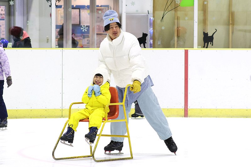 一方、丸は何も教えてもいないのに、僕につかまって立つことができました。さすが子どもは飲み込みが早い! でもまだ滑ることは難しいので、椅子型のそりに乗って、僕が押しながらリンクを周回。ほっぺに当たる風が冷たくて気持ちいい! そりを押しながら滑れば、僕の練習にもなるし、丸も大喜び。王様のように「もっと、もっと」と命令して、僕は丸を乗せたそりを押しながら滑り続けました。