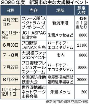 新潟市にとって、2026年度は国際会議や大規模イベントが相次いで開かれる「当たり年」。市は来訪者を市内の飲食店などに誘客し、リピーター獲得につなげるための取り組みに一段とギアを上げる。市街地に外国語の案内表示を増やすほか、イベントの情報を1カ所にまとめて公開。周辺自治体を含む商工・観光関係者約300人を集めた「観光戦略会議」も初めて開き、「おもてなし」意識の浸透を図った。