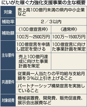 25年度一般会計補正予算に、新事業「にいがた稼ぐ力強化支援事業」として6億3千万円を盛った。国の重点支援地方交付金を活用し、補助額を大幅に引き上げた。