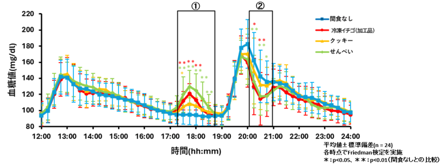 夕食後の血糖値上昇において、冷凍イチゴ(加工品)群およびせんべい群は間食なし群と比較して有意な抑制(セカンドミール効果)を示しました。一方で高脂質のクッキー群ではこの効果は認められませんでした。