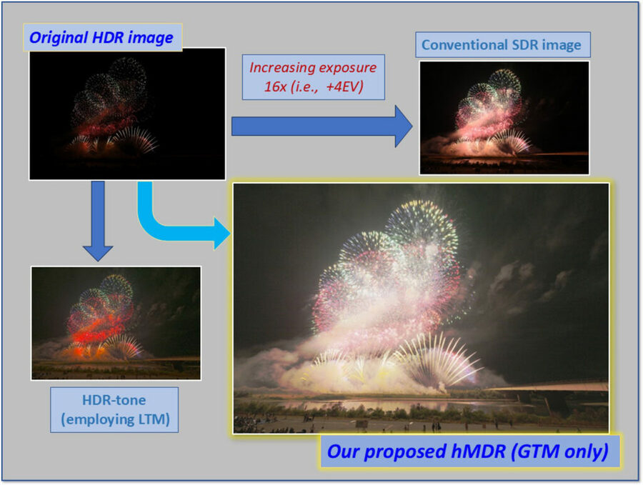 HDR → hSDR1 → hMDR2 という2段階の画像変換方式を開発。