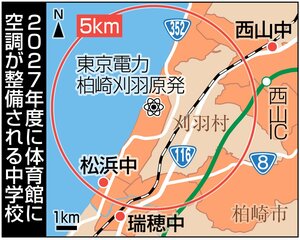 柏崎市は2027年度、瑞穂、松浜、西山の3中学校の体育館に空調設備を整備する。気密性を高める工事も施し、東京電力柏崎刈羽原発で重大事故が起きた際には、住民らの被ばくを防ぐ屋内退避施設として活用する。市は体育館への空調設置に消極姿勢だったが、国の交付金を使って30年度までに、市内全11校の体育館で環境を整えていく。