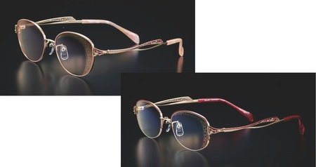 テンプルの透かし彫りとヨロイに配した色とりどりの宝石が優美な輝きを放ちます。このコレクションにHOYAのレーザー技術「 Glint Veil 」がコラボレーションすることで、レンズ面からサイドにかけて流れるような統一感のある表現となりました。