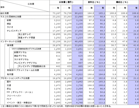(1)マスコミ四媒体広告費(新聞、雑誌、ラジオ、テレビメディア広告費の合算。それぞれの広告費には制作費も含まれている)、(2)インターネット広告費(インターネット広告媒体費、物販系ECプラットフォーム広告費、インターネット広告制作費の合算)、(3)プロモーションメディア広告費(屋外、交通、折込、DM<ダイレクト・メール>、フリーペーパー、POP、イベント・展示・映像ほかの合算)。