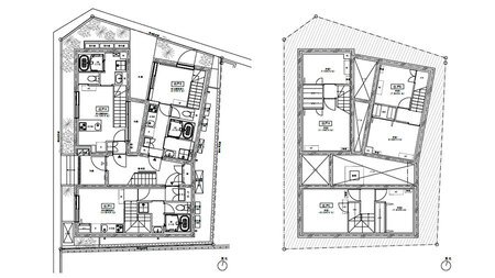 外観は、一棟でありながら、まるで3棟が独立して建ち並ぶかのようなボリューム構成とし、都市景観にシャープで洗練された存在感をもたらします。コンクリート打放しを基調とした素材感と、計算された開口部の配置により、住まう人の感性に静かに響くデザインを実現しました。