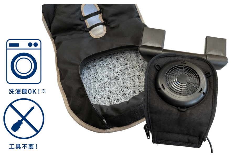 ファン部分はファスナーで簡単に取り外しができ、工具は不要です。