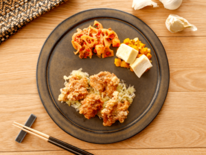 このたび、多くのお客様のご要望にお応えし、「にんにく醤油から揚げ」が再登場します。にんにく醤油のガツンとしたコクと香ばしさはそのままに、今回は主菜を引き立てる添え野菜と副菜を厳選し、より満足感のある一皿に仕上げました。添え野菜のキャベツには相性抜群の高菜を混ぜ込んでおり、から揚げと一緒に、またはそのままでも美味しくお召し上がりいただけます。
