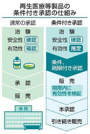 人工多能性幹細胞(iPS細胞)を使った二つの再生医療等製品が、世界初の実用化の承認を得た。対象となる疾患の患者らからは、治療の道が開ける可能性に期待が集まる。ただ、今回の条件と期限付きの承認はいわば「仮免許」に過ぎない。販売後、最長7年かけ症例を積み重ね、有効性の検証が必要となるが、過去には本承認を断念した例も。専門家は「承認はゴールではなく、スタートだ」と強調する。