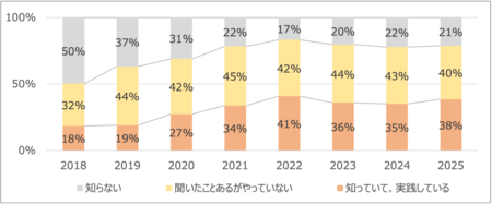 2018年度から2021年度にかけて、「知らない」層が減少してきたが2022年以降20%前後で推移。