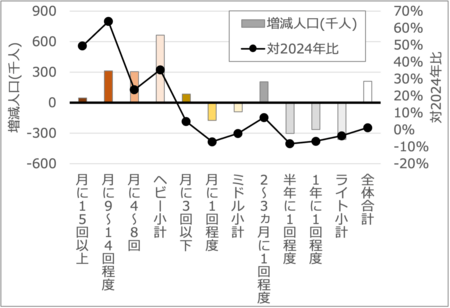 2024年比で-2%, ライトサウナーは対2024年比で-3%の減少となっている。唯一、ライトサウナーにお