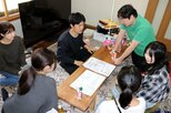 鬼太鼓で使うわらじを編む参加者=佐渡市千種