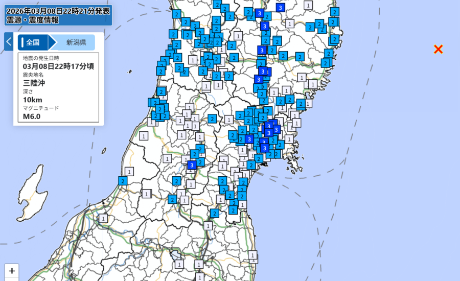 8日午後10時17分ごろ、三陸沖を震源とする地震があり、青森、岩手、宮城、山形の各県で震度3を、県内では村上市で震度2、阿賀野市で震度1を観測した。新潟地方気象台によると、震源の深さは約10キロ、地震の規模はマグニチュード(M)6・0と推定される。