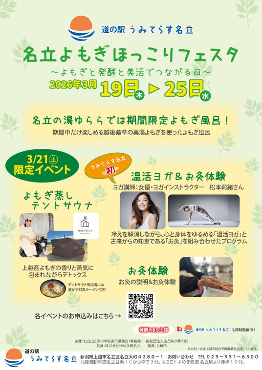 互恵株式会社グループの株式会社ゆめ企画名立(新潟県上越市 代表取締役:細谷 貴雄)が運営する「道の駅 うみてらす名立(新潟県上越市)」(所在地:新潟県上越市、代表取締役:細谷貴雄)が名立山と海の学校実行委員会と共催で、2026年3月19日(木)から2026年3月25日(水)の期間、「名立よもぎほっこりフェスタ~よもぎと発酵と美活でつながる日~」を開催いたします。