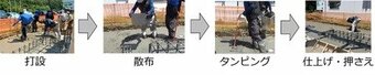 今回開発した「マクチップ工法」は、コンクリートを打設し硬化する前に、散布機を用いてPP短繊維を表面に散布し、コンクリート表面を締め固めるタンピングによって繊維を内部に埋め込み、仕上げを行う施工方法です。ミキサー車に繊維を投入しないため、従来の混練工法で必要だった洗浄作業が不要となり、省力化に貢献します。