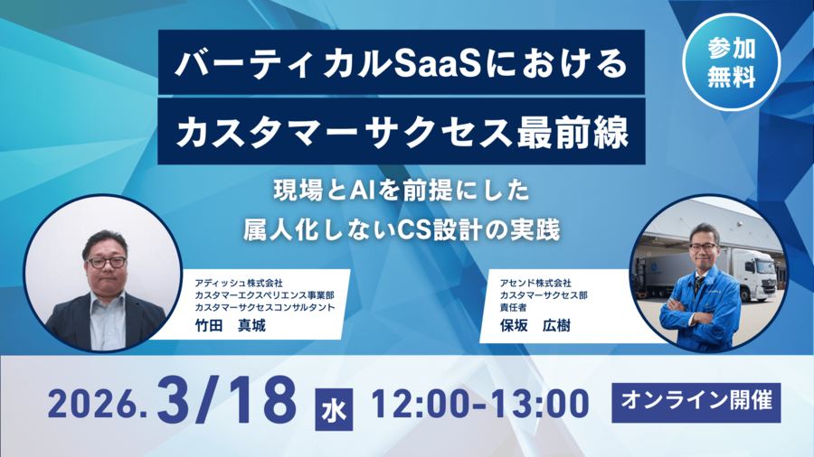 アディッシュ株式会社(本社:東京都品川区、代表取締役 江戸 浩樹、証券コード:7093、以下 アディッシュ)は、運送業向け業務管理クラウドシステム「ロジックス」を提供しているアセンド株式会社 カスタマーサクセス部 責任者の保坂 広樹氏をゲストに迎え、ウェビナー「バーティカルSaaSにおけるカスタマーサクセス最前線」を2026年3月18日(水)に開催します。