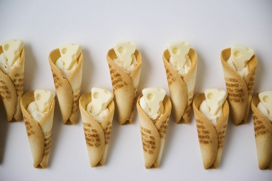 バターの香りとさっくりとした食感のチーズラング・ド・シャに、ほのかにミルクが香るホワイトチョコレートクリームとチーズ風味のチョコレートを飾りました。
