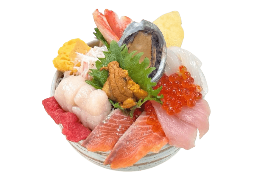 函館の老舗鮮魚店が営む回転寿司店「まるかつ水産」。魚屋直営だからできる鮮度の良いネタを味わえます。北海道産の天然エゾアワニ煮、ホタテ、イクラ、イカなど贅沢な食材を溢れんばかりに詰め合わせた、北海道の幸を満喫できるしあわせ丼です。