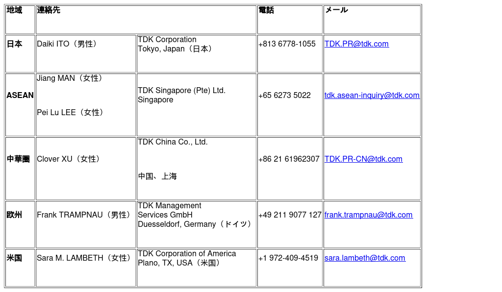 TDK株式会社(TSE:6762)は、東京に本社を置く、エレクトロニクス業界の技術的世界大手企業であり、革新を牽引しています。TDKは、「いろんなところに、TDK(In Everything, Better)」をキャッチフレーズに、生活、産業、社会のあらゆる側面において、より良い未来を実現することを使命としています。90年以上にわたり、フェライトコアやカセットテープのパイオニアとして一時代を築いたTDKは、最先端の部品やセンサー、電池でデジタル時代を支え、より持続可能な未来をリードしてきました。ビジョン、勇気、そして相互信頼をベースにしたスタートアップ精神、TDKベンチャースピリットで結ばれたTDKの情熱的なチームメンバーは、自分たちのため、お客様のため、パートナーのため、そして世界のために、より良いものを追求しています。今日、TDKの最先端技術は、産業用アプリケーション、エネルギーシステム、電気自動車、スマートフォン、ゲームなど、現代生活の中核をなすあらゆる分野で活躍しています。同社の包括的かつ革新的なポートフォリオには、最先端の受動部品、センサーおよびセンサーシステム、電源、リチウムイオン電池およびソリッドステート電池、磁気ヘッド、AIおよびエンタープライズソフトウェアソリューションなどがあり、市場を牽引する数多くの製品群を擁しています。これらは、TDK、EPCOS、InvenSense、Micronas、Tronics、TDK-Lambda、TDK SensEI、ATLの製品ブランドで販売されている。同社は、AIエコシステムを重要な戦略分野と位置づけ、自動車、情報通信、産業機器の各分野にまたがるグローバルネットワークを活用し、幅広い分野で事業を展開しています。 2025年度のTDKの売上高は144億米ドル、従業員数は全世界で約10万5,000人でした。