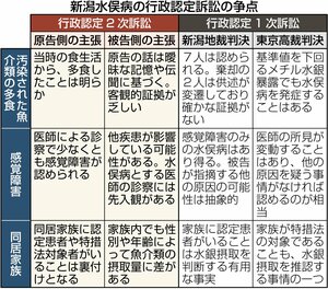 水俣病の認定申請を棄却された新潟市と阿賀野市に住む男女8人が認定業務を行う県と新潟市を相手取り、棄却処分取り消しと認定の義務付けを求めた新潟水俣病第2次行政認定訴訟の判決が12日、新潟地裁(鈴木雄輔裁判長)で言い渡される。新潟水俣病の第1次行政認定訴訟では2017年に東京高裁が原告9人全員の認定を市に命じて確定しており、この判断の枠組みを維持するかどうかが焦点となる=表参照=。