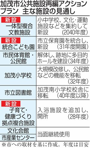 加茂市は9日、2026年度から20年間の公共施設の在り方をまとめた「公共施設再編アクションプラン」を明らかにした。小中学校や文化・運動施設などを集約する「一体型複合文教施設」や、市立保育園を統合するこども園を新設する。老朽化した市民体育館を取り壊し、跡地に避難所や集会所の機能を備えた多目的ホールを整備する。