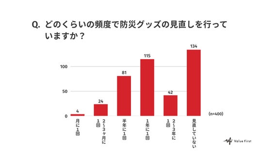 「どのくらいの頻度で防災グッズの見直しを行っていますか?」という質問に対し、回答者の3割以上が「見直していない(134件)」と回答しました。