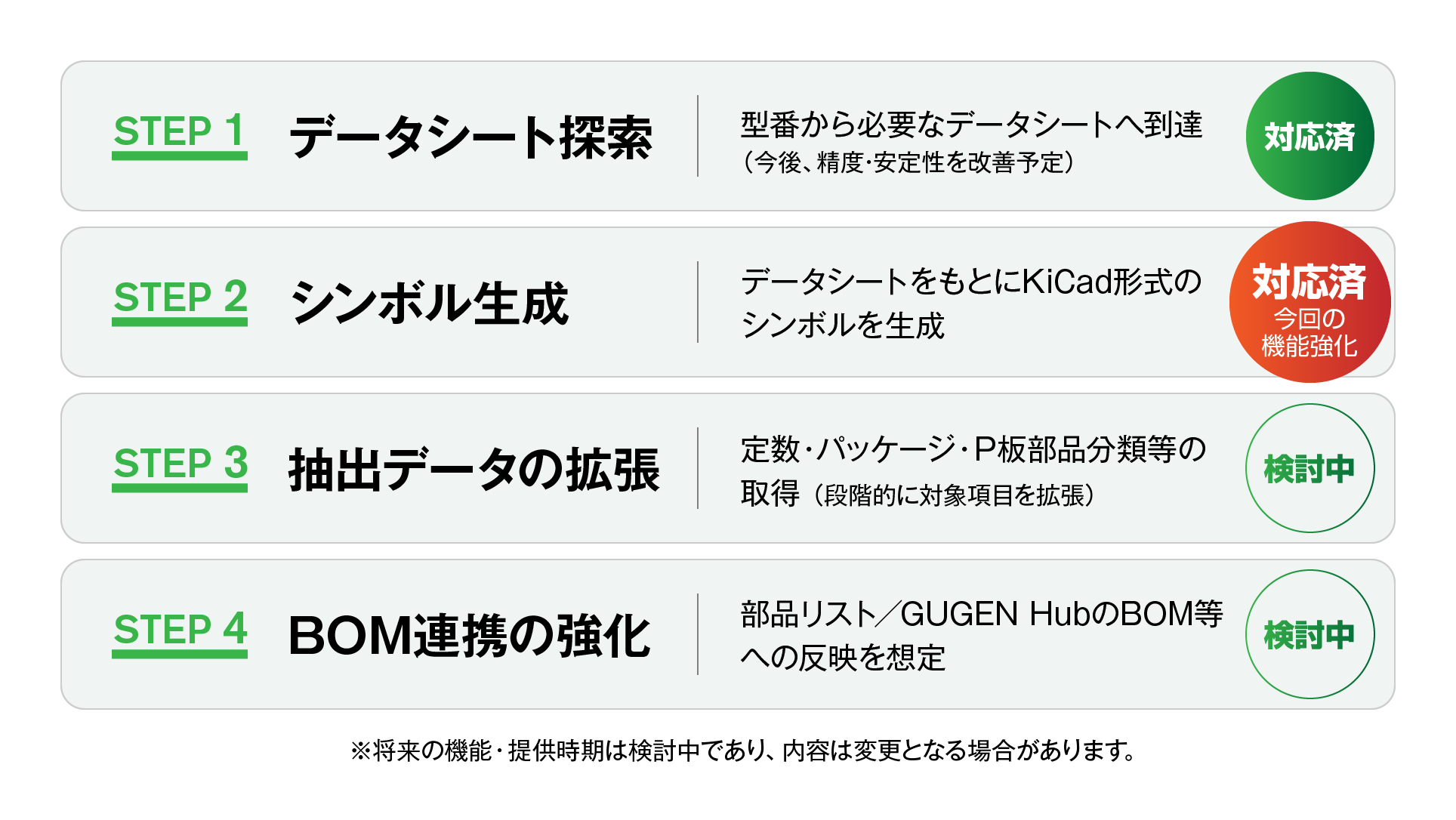 また「データシートちゃん」は、設計前工程における情報探索・データ整備を起点に、業務の効率化と自動化を段階的に推進するための取り組みの一つとして位置付けています。今回のシンボル生成機能追加に続き、今後は以下の改善を進めてまいります。
